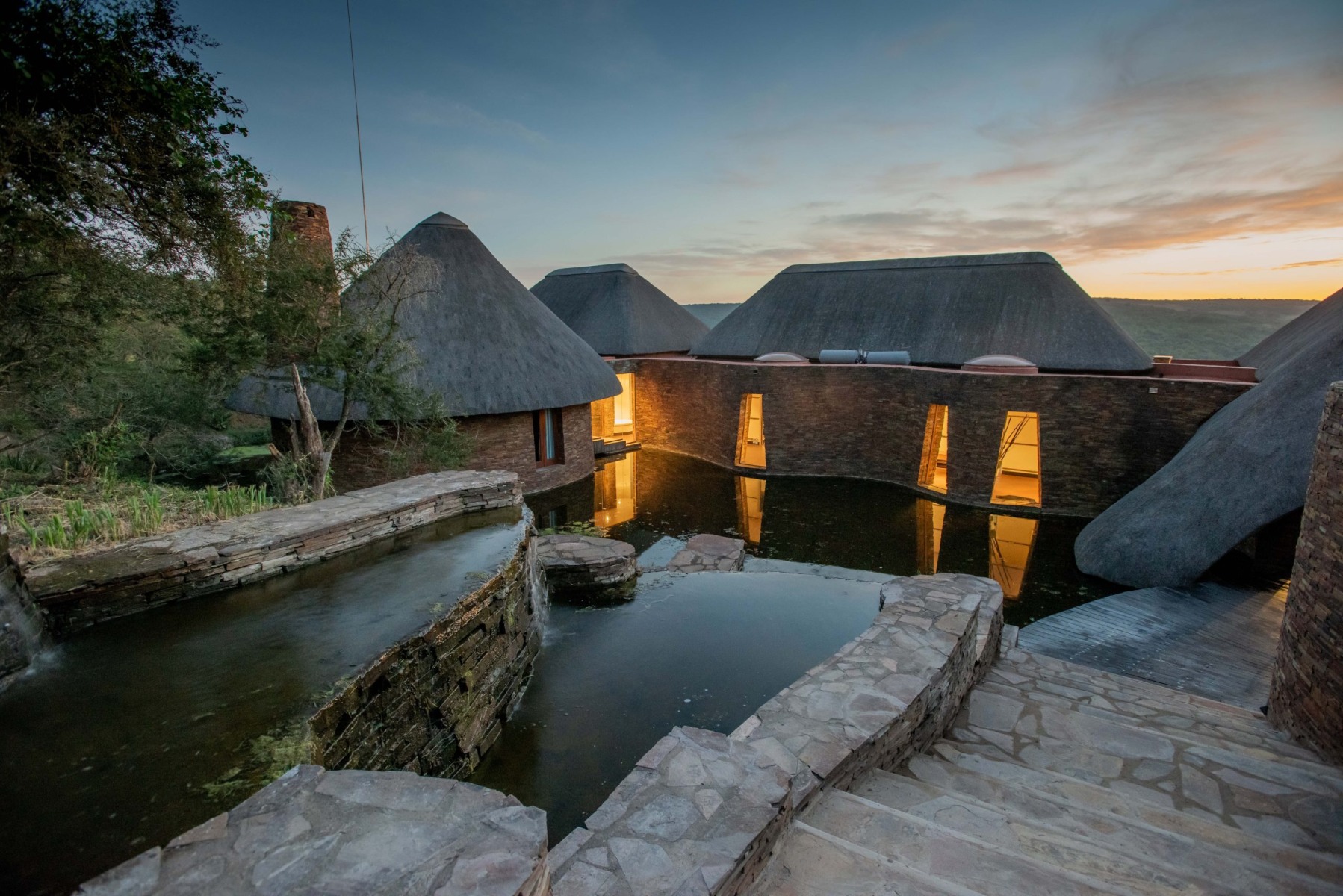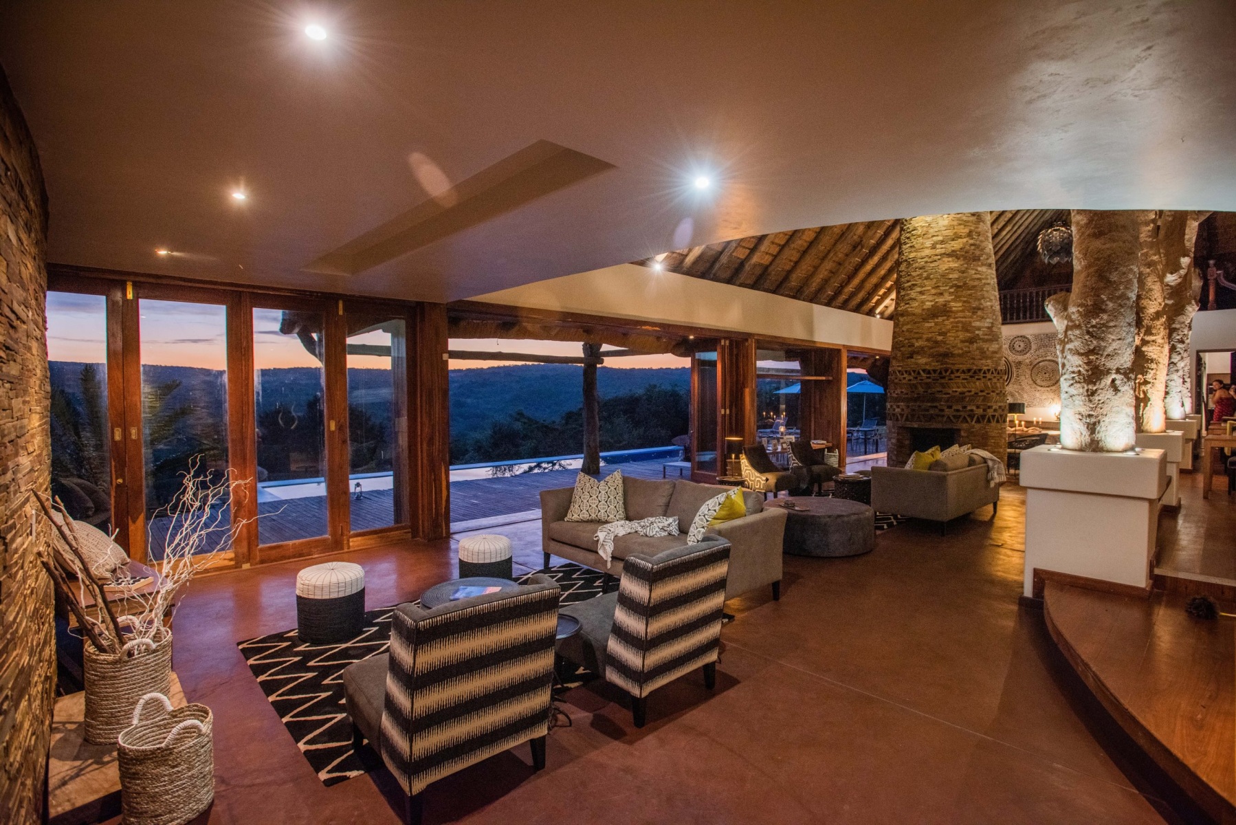 Built by a team of artisans with locally sourced shale, Leadwood Lodge combines exceptional architecture, towering thatch and resplendent finishes against a backdrop of breath-taking natural beauty. The décor is an eclectic merging of antique and organic Africa with one-of-a-kind artistic elements. The lodge was designed on an ethic of ‘nothing straight, nothing painted’ and the final results are a masterpiece of earth, water, glass and hardwoods. A place of relaxation and tranquillity. Only available for groups of 6 to 12 people.