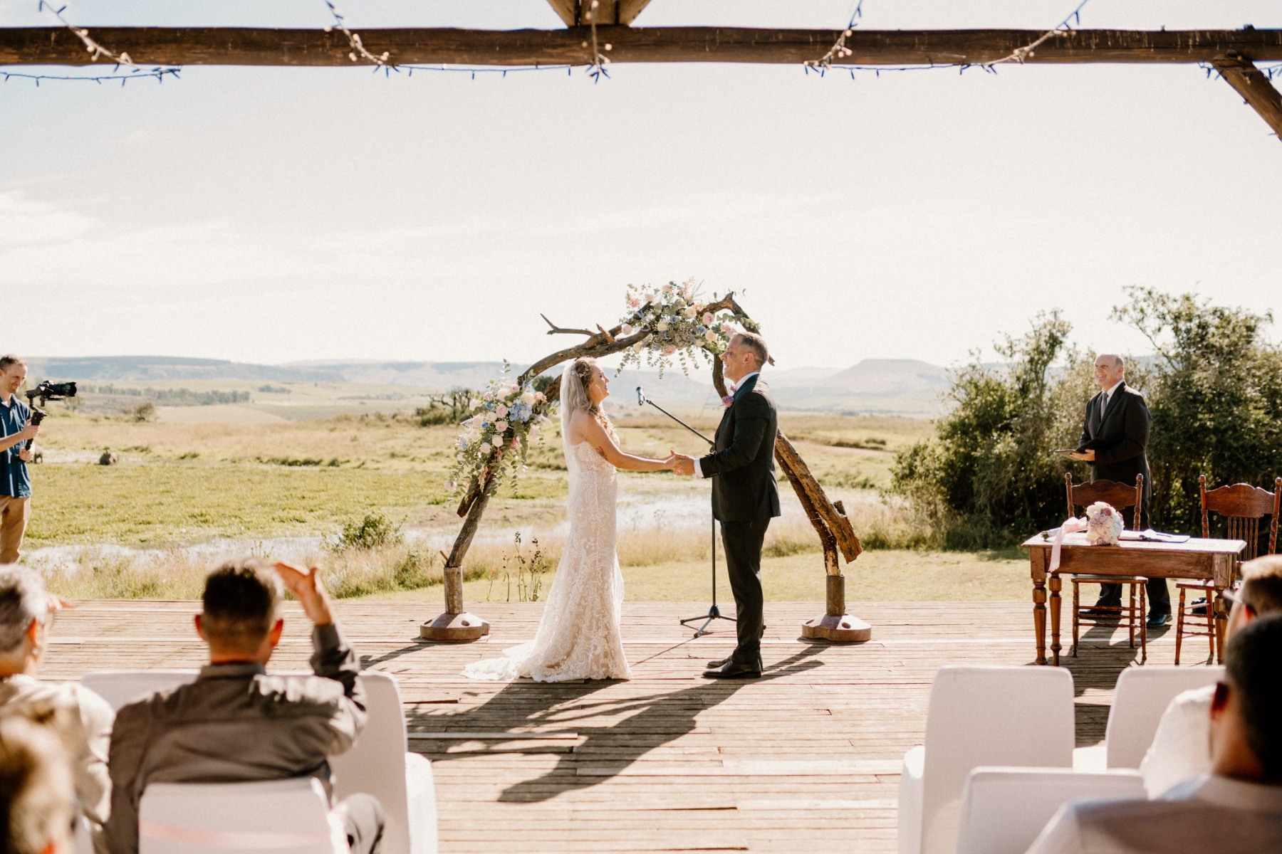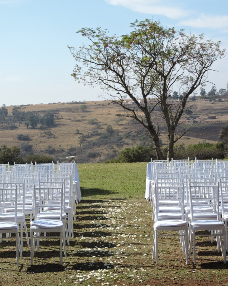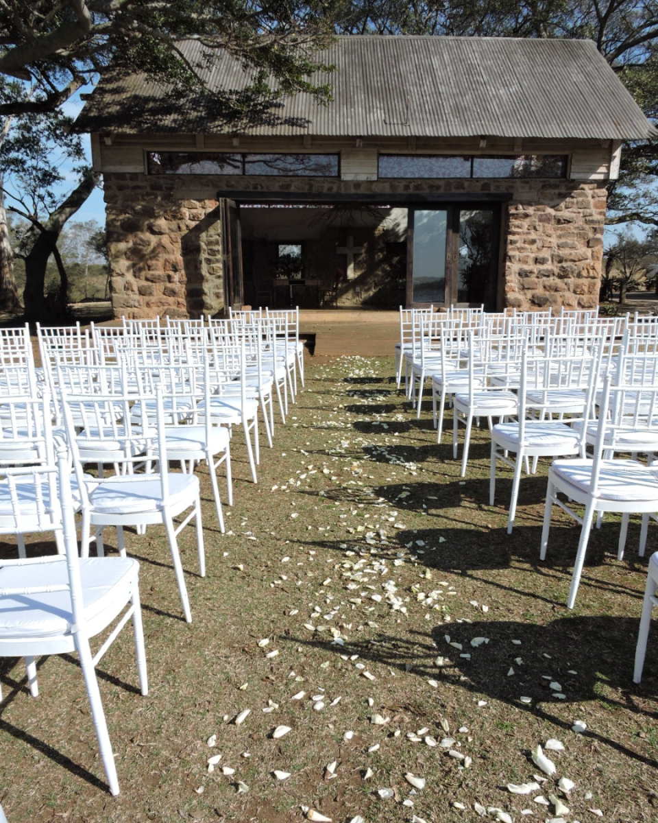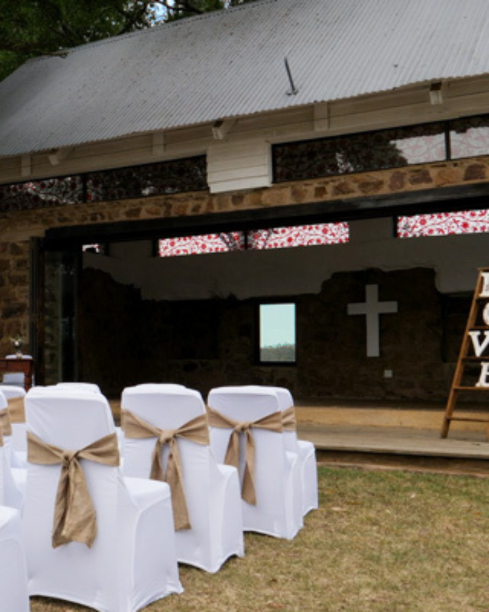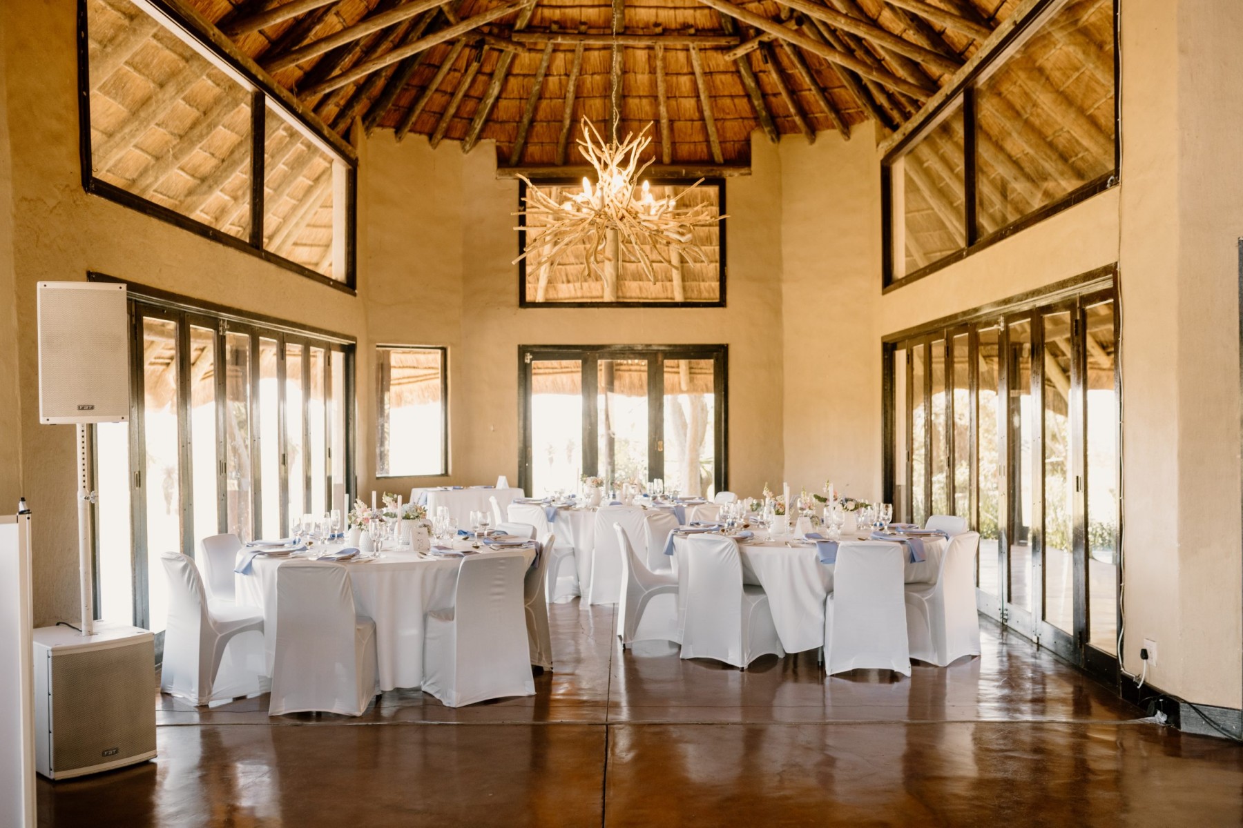 The Acacia venue seats up to 120 guests inside the hall with the predominant features at Acacia being the tall glass concertina doors that surround this open-plan structure and open out onto the great wooden deck that stretches out towards the watering hole. The wooden deck is an ideal and a very popular option for outdoor wedding ceremonies, especially in the late afternoon with the sun setting in the distance behind the rolling hills. It is also this time of day that animals such as Zebra, Waterbuck, Blue Wildebeest and White Rhino − to name but a few − come down to the watering hole to drink, allowing for exquisite photo opportunities.